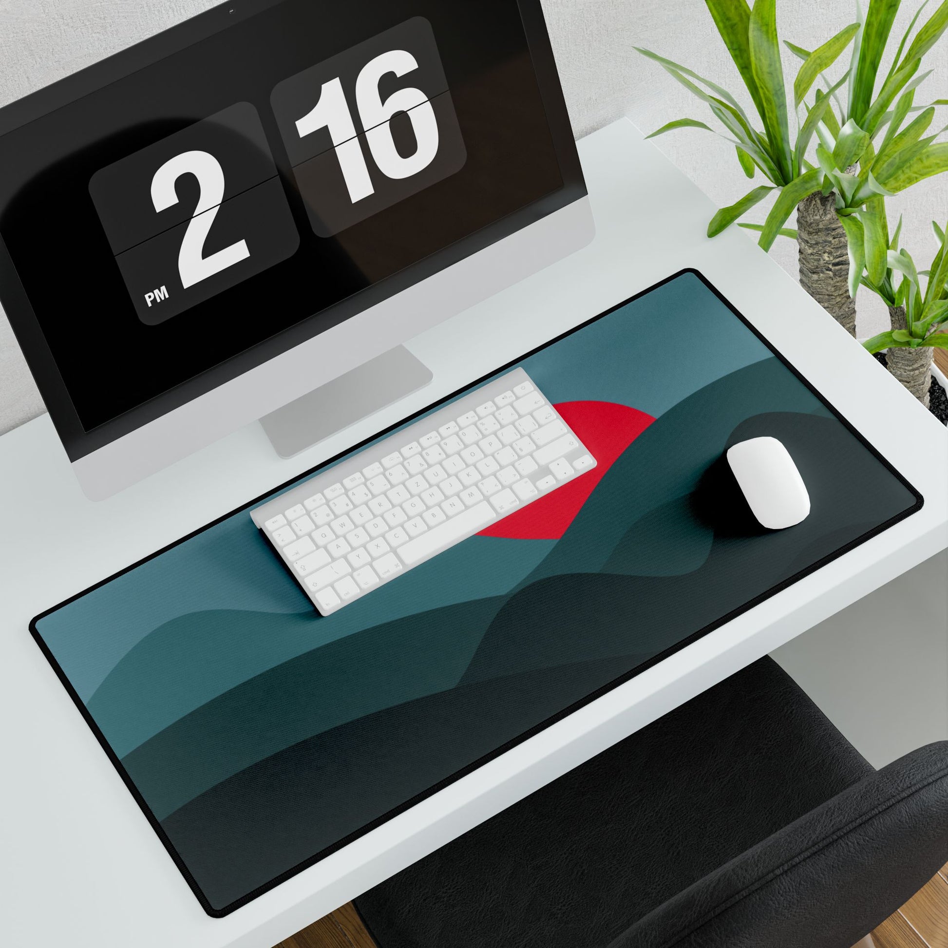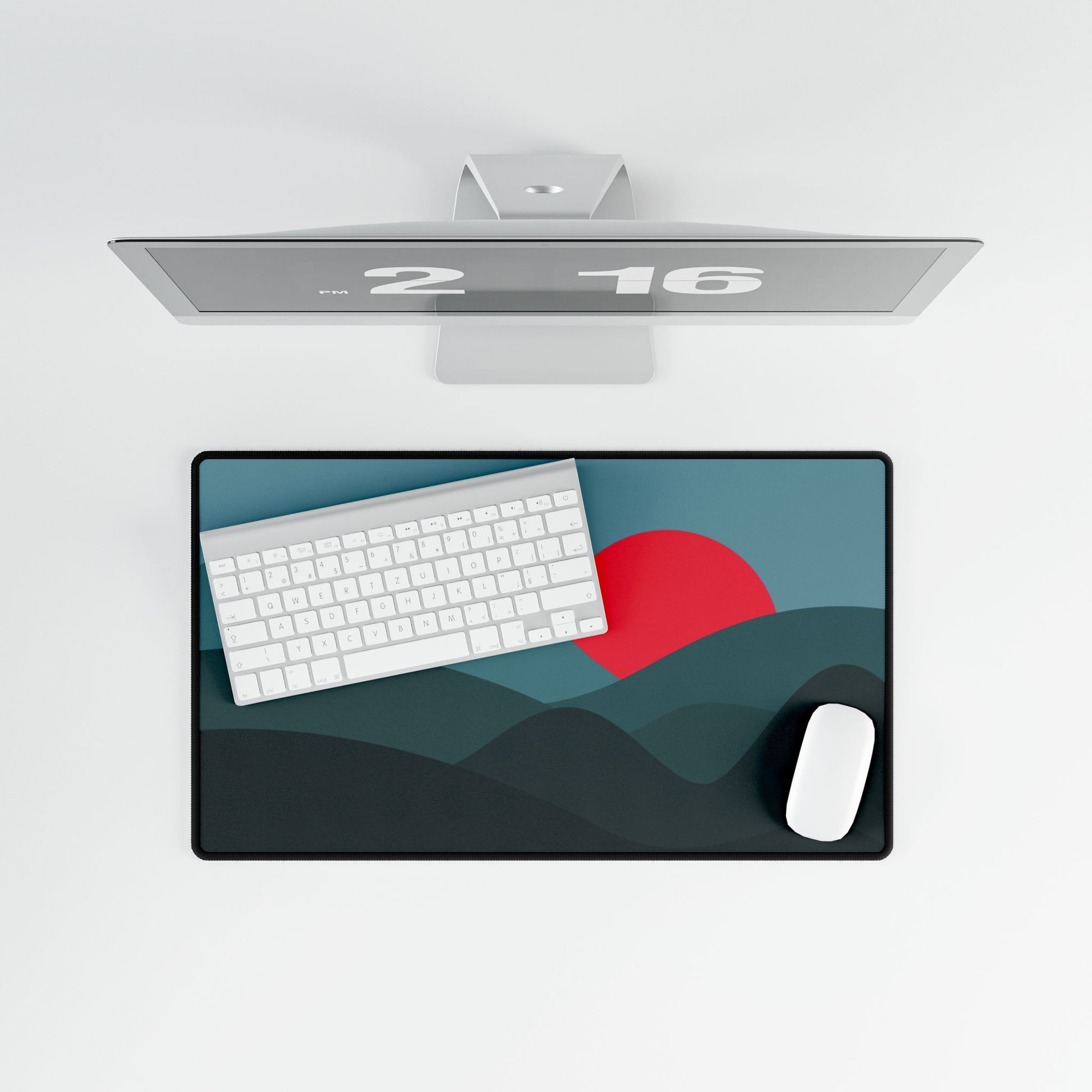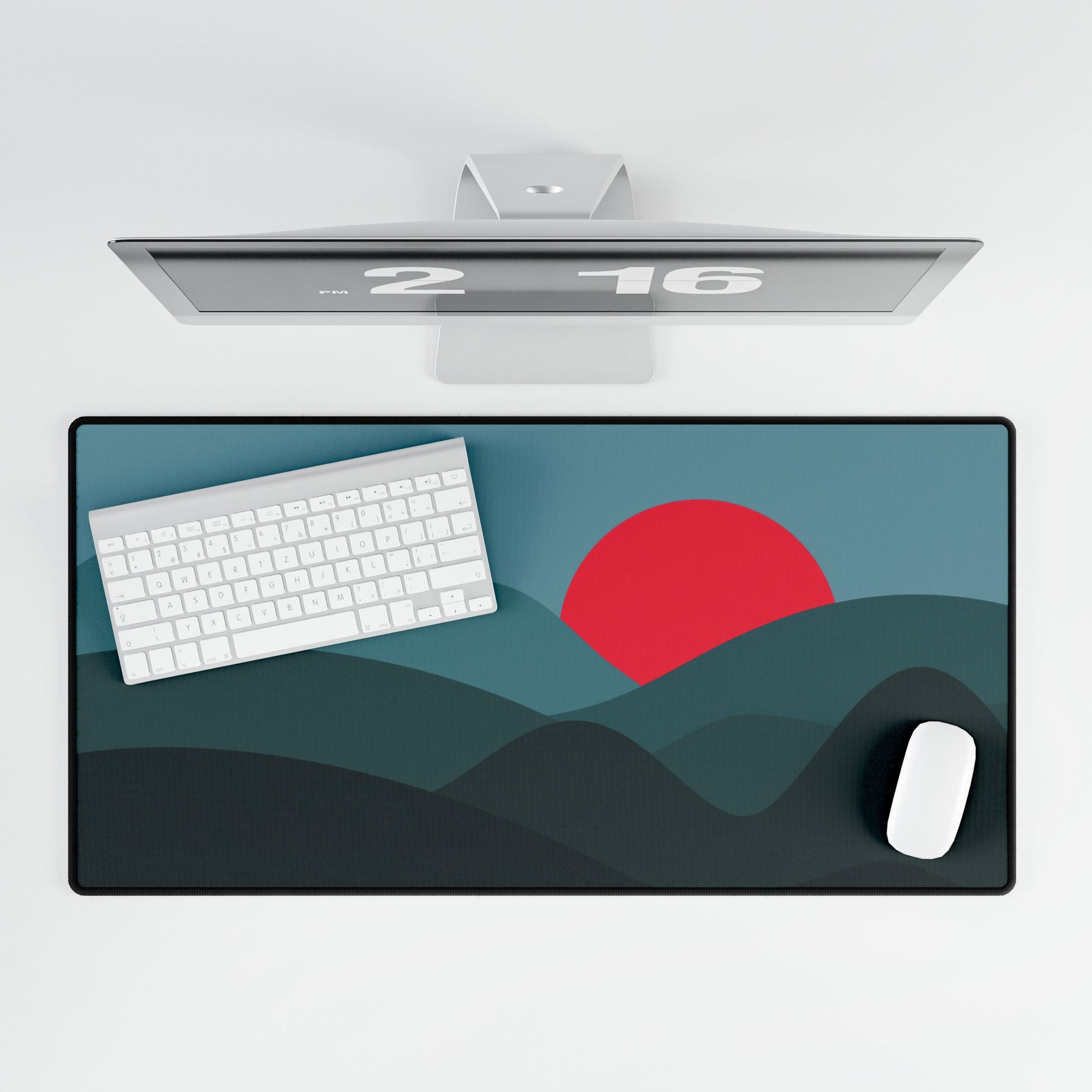 Deep teal hills frame a bold red sun — a sleek, minimalist look that makes your desk stand out.