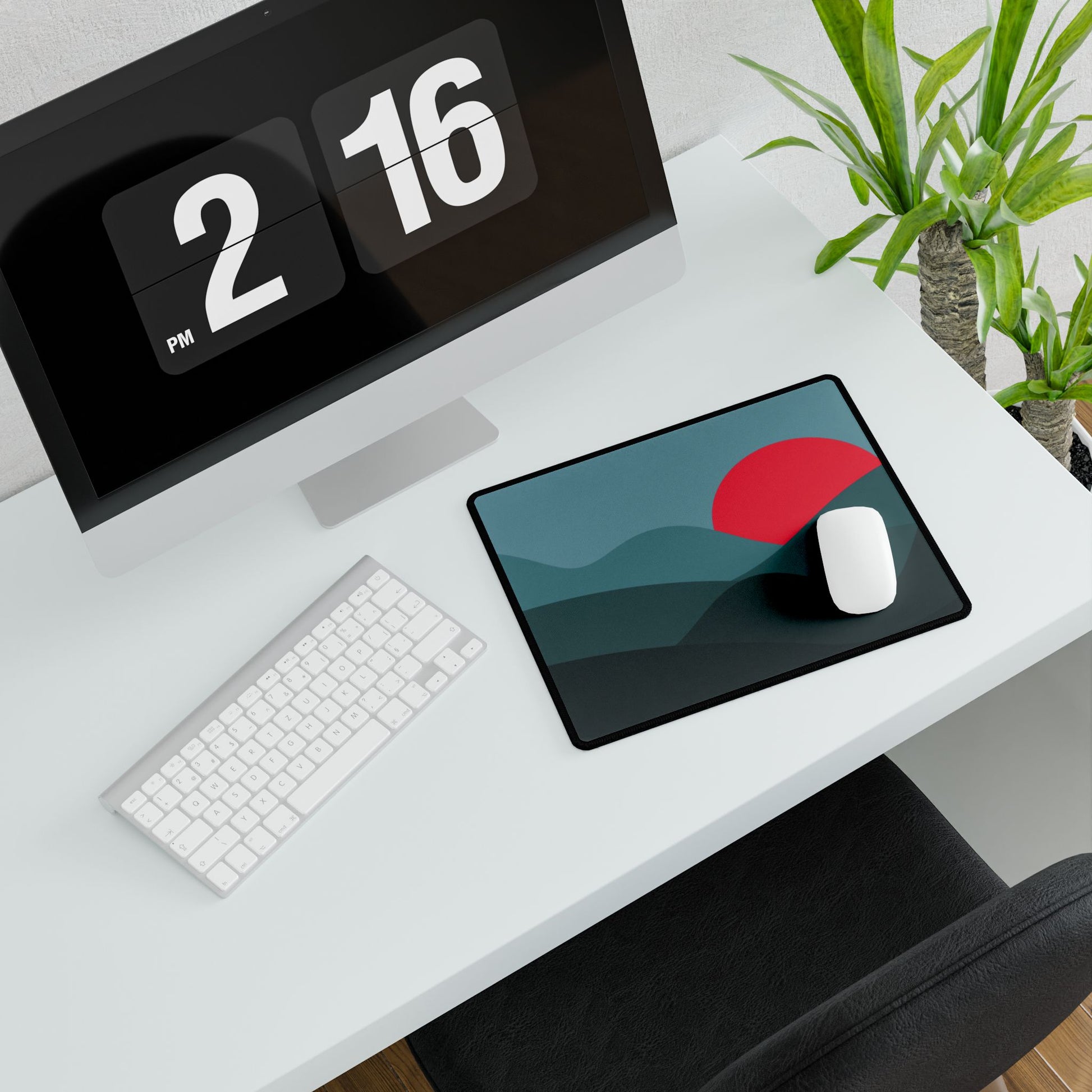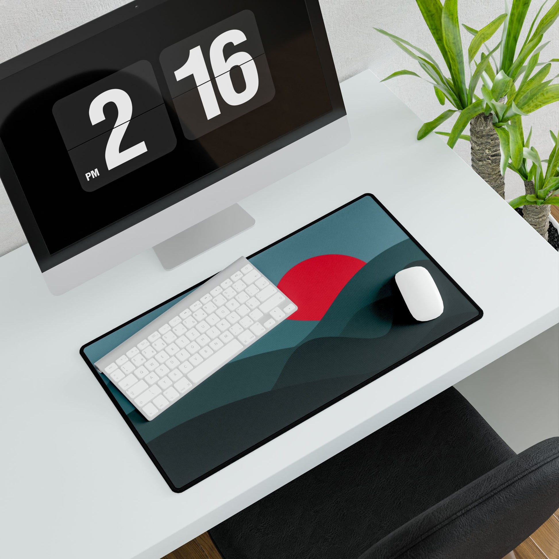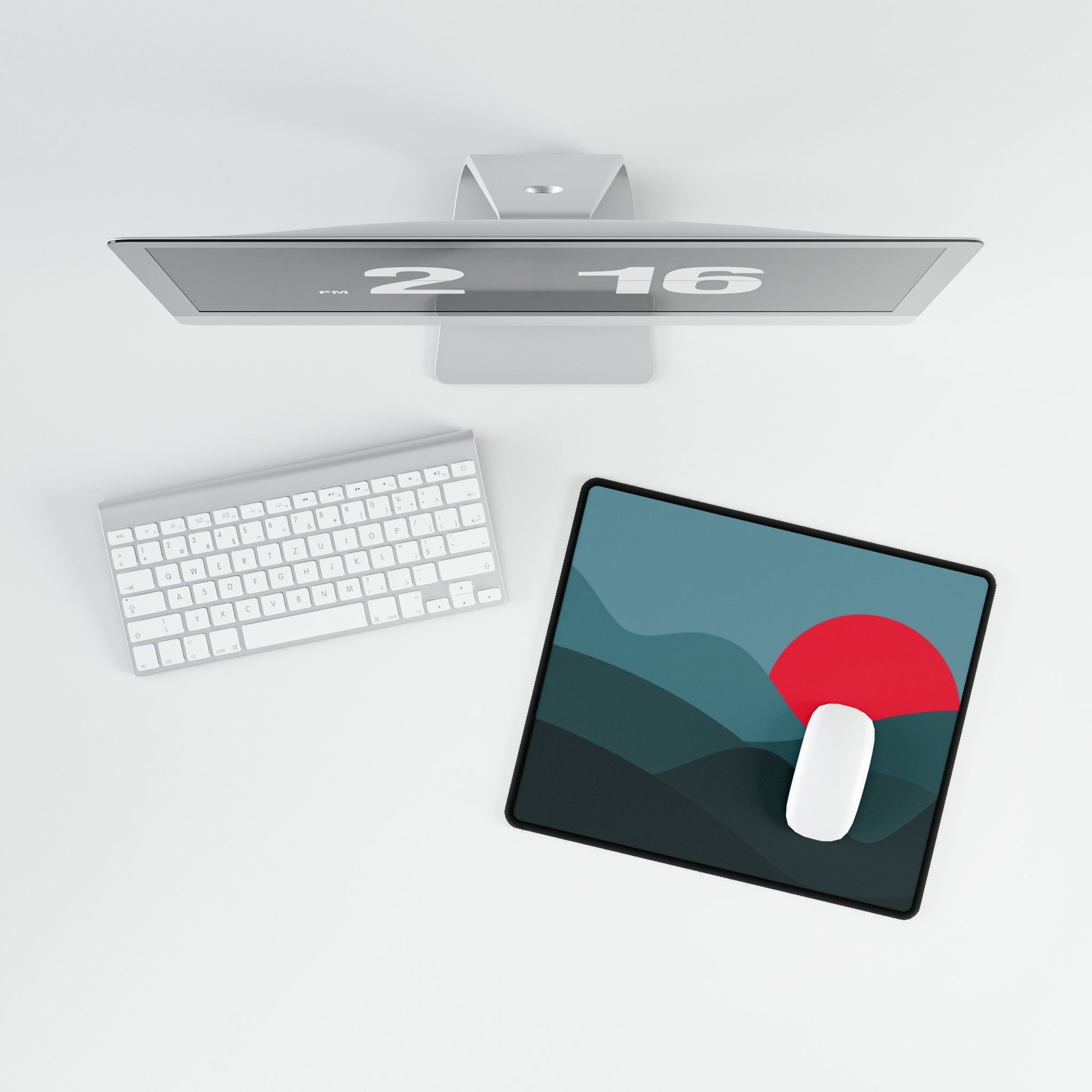 Deep teal hills frame a bold red sun — a sleek, minimalist look that makes your desk stand out.
